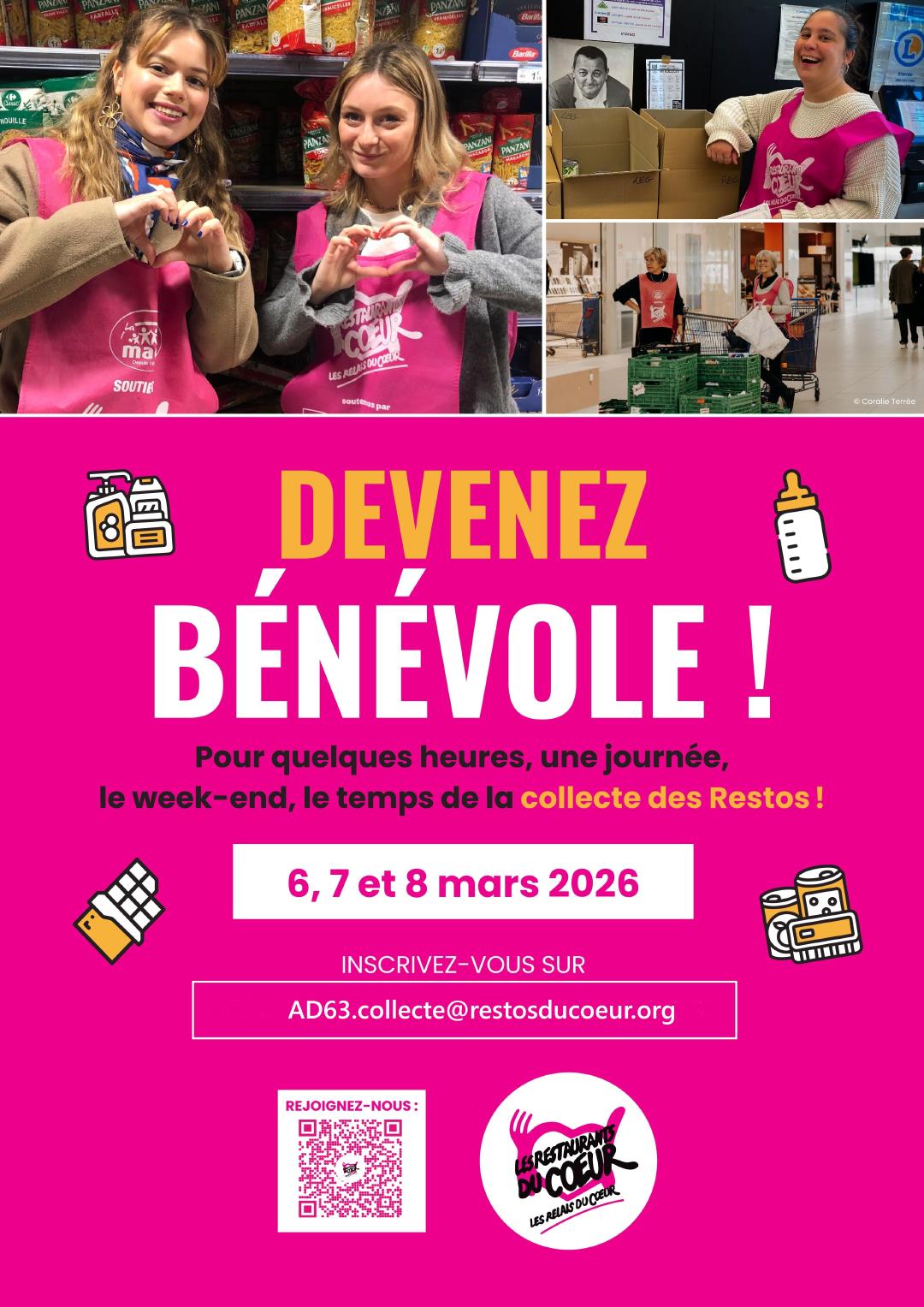 Les 6, 7 et 8 mars 2026, les Restos du C?ur organisent leur grande collecte nationale sur l’agglomération clermontoise. Devenez bénévole le temps d’une journée ou d’une demi-journée : chaque participation compte.