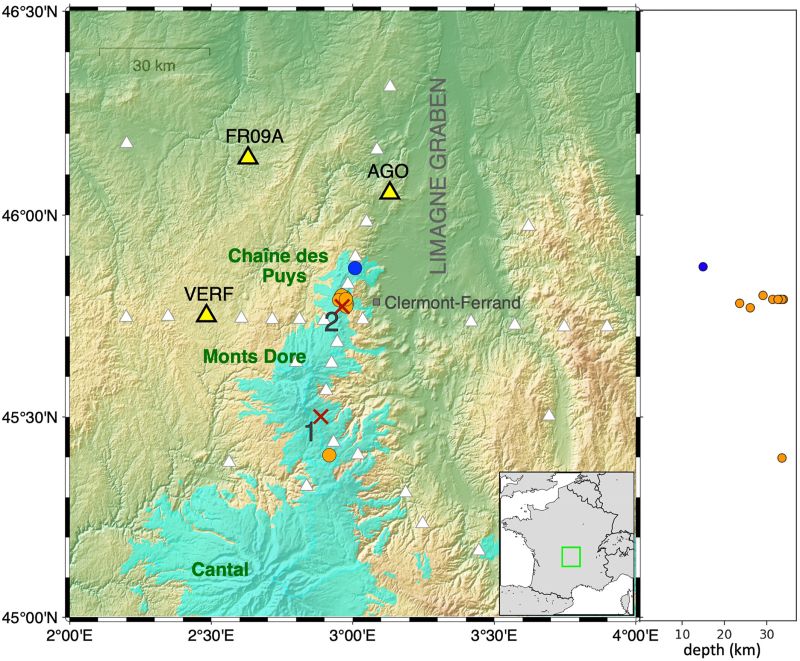 Dans le cadre du projet ANR MACIV (Imagerie sismique multi-échelle des sources du volcanisme du Massif Central) visant à sonder la structure profonde du Massif central, 100 sismomètres à large bande ont été installés (2023-2024) temporairement, complétant le réseau large bande permanent (RLBP) de l’infrastructure de recherche Epos-France.Carte montrant les épicentres des séismes DLP (cercles oranges) et leurs profondeurs dans le panneau à droite. Les triangles indiquent les stations sismiques. Les croix rouges indiquent : (1) le groupe de volcans du Pavin et (2) les volcans du Puy de D?me