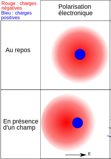 Schéma de la polarisabilité électrique d'un atome. Au repos, le centre des charges "+" (le noyau atomique, en bleu) et le centre des charges "-" (le cortège électronique, en rouge) co?ncident. En présence d'un champ électrique E, les deux centres de gravité s'écartent l'un de l'autre, créant ce que l'on appelle un dip?le, caractérisé par une polarisabilité électrique.