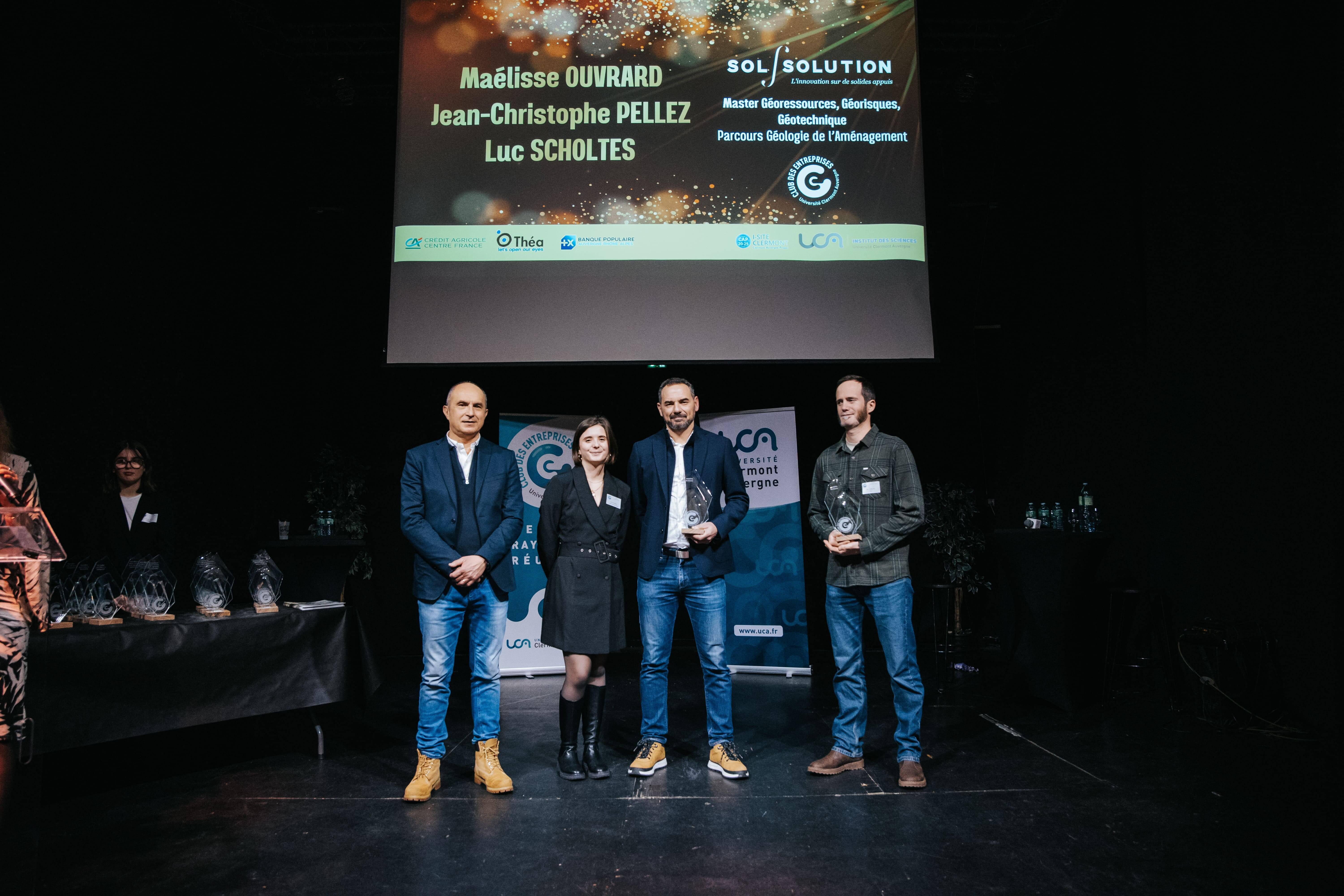 Prix remis par Astrid MESSY des Laboratoires Théa (sponsor) à Ma?lisse OUVRARD (étudiante en Master Géoressources, Géorisques, Géotechnique (3G) à l'OGPC), son responsable de formation Luc SCHOLTES, et son tuteur entreprise Jean-Christophe PELLEZ, pour le projet de stage au sein de l'entreprise Sol Solution.