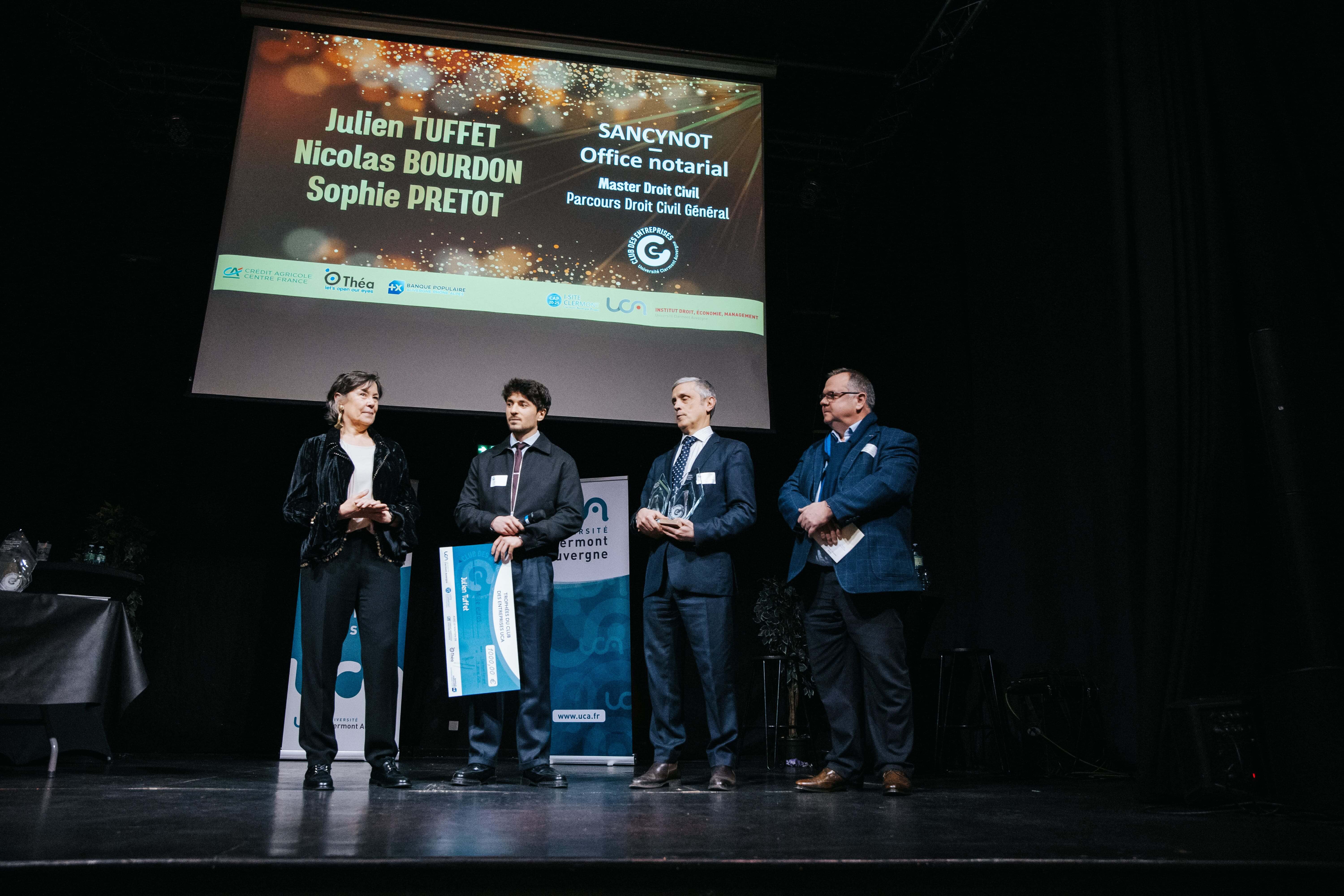 Prix remis par Philippe BEY de la Banque Populaire Auvergne Rh?ne Alpes (sponsor) à Julien TUFFET (étudiant du Master 2 Droit Civil Général), ses responsables de formation Sophie PRETOT et Jean Fran?ois RIFFARD, et son tuteur entreprise Nicolas BOURDON pour un stage de fin d'études réalisé au sein de l'office notarial SANCYNOT.