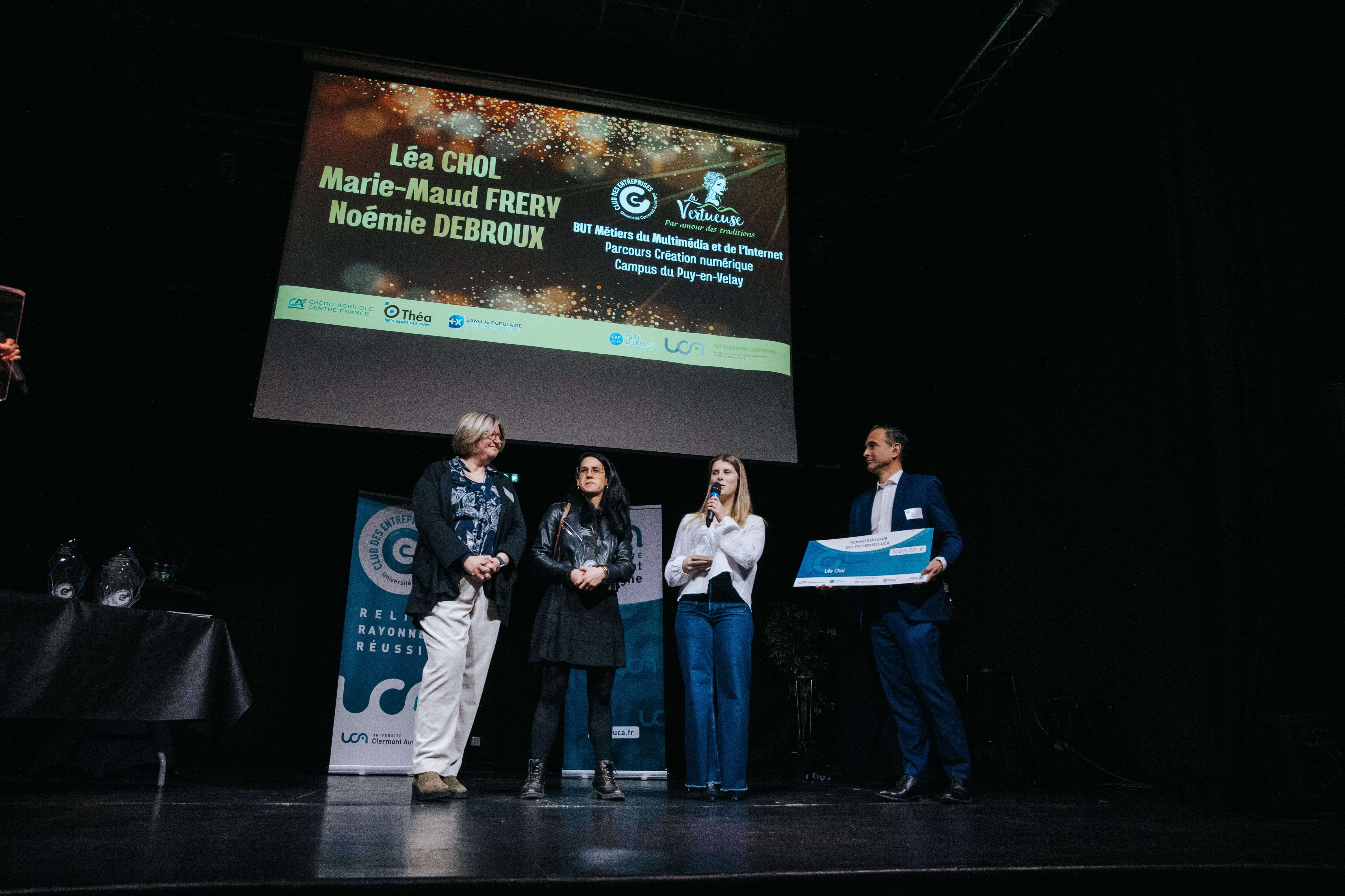 Prix remis par Emmanuel CHARRITTON du Crédit Agricole Centre France (sponsor) à l'étudiante Océane RAGAIN (étudiante en Master Direction de projets ou établissements culturels parcours Action culturelle et artistique), son enseignante Claire ROUET, et ses tutrices entreprise Sarah MATTERA et Violaine MOREAU pour le projet de stage au sein de Mille Formes, Centre d'initiation à l'art porté par la Ville de Clermont-Ferrand.