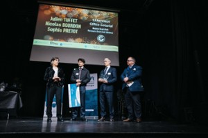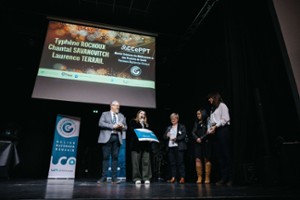 Prix remis par Farida TOMASELLA d'Environnement Recycling à Typhène ROCHOUX (?tudiante en Master 2 Sciences du médicament et des produits de santé), son enseignante Laurence TERRAIL, et sa tutrice entreprise Chantal SAVANOVITCH pour un stage au sein du Laboratoire ACCePPT.