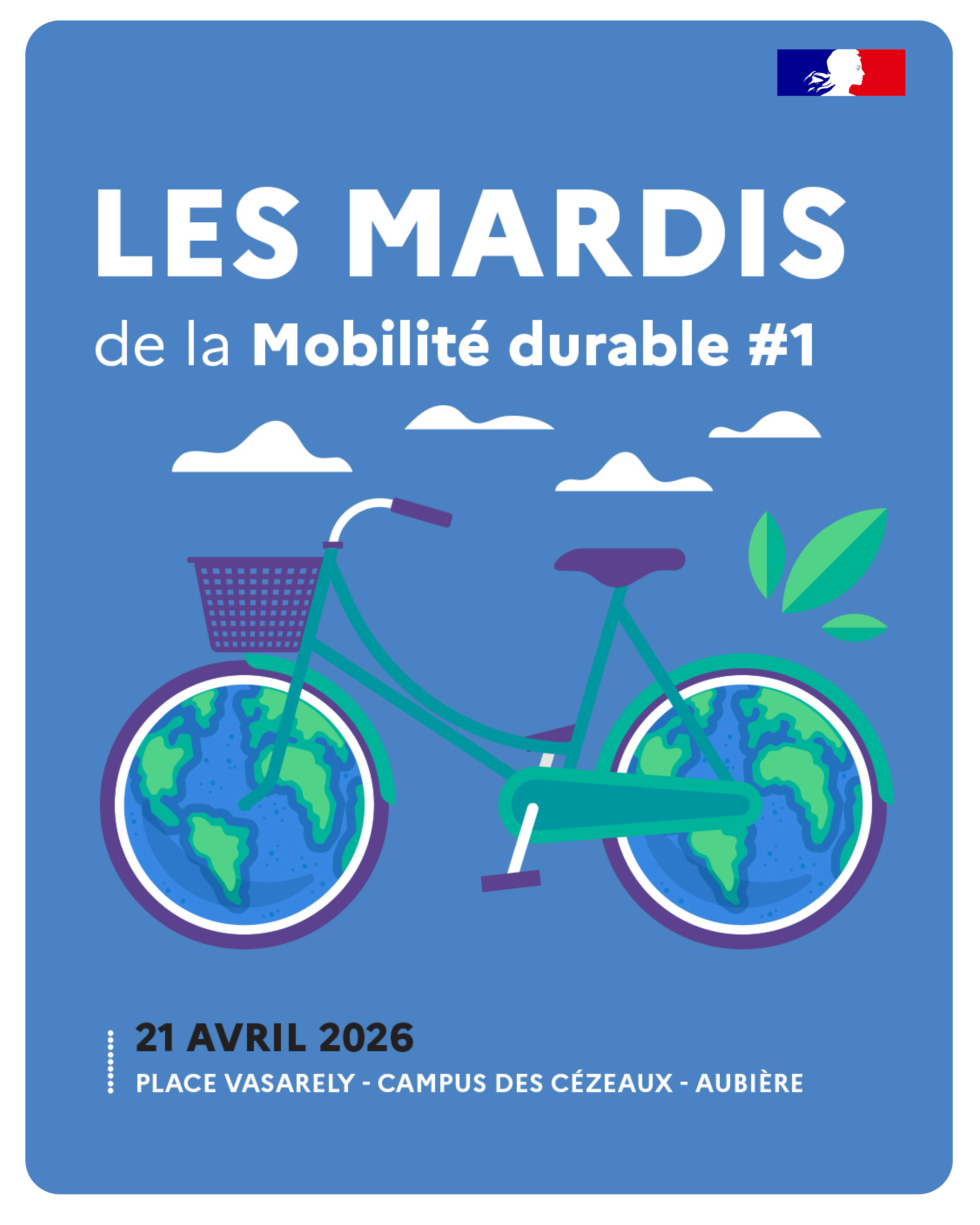 Le premier rendez-vous hebdomadaire se tiendra aux Cézeaux le mardi 21 avril 2026. Des stands d'information et d'animation seront tenus entre 10h et 14h Place Vasarely et offriront la possibilité aux étudiants et personnels de découvrir et tester des alternatives durables pour leurs déplacements du quotidien. Des vélos seront également proposés à la vente à des tarifs avantageux. Attention, ces vélos seront en quantité limitée !