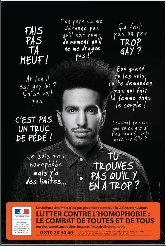 • un jeu de quatre affiches qui reprennent des insultes ou propos communément entendus qui marquent profondément les étudiant-e-s gays, lesbiennes, bisexuels ou trans',