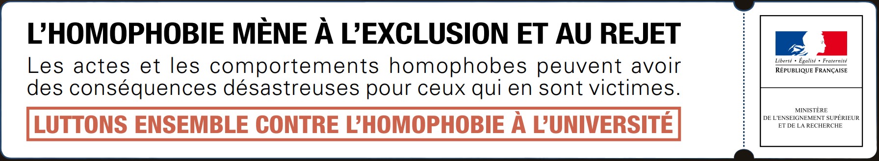 "Lutter contre l'homophobie : le combat de toutes et de tous" vise à sensibiliser les étudiants et l'ensemble des personnels des établissements d'enseignement supérieur aux difficultés rencontrées par certains étudiants encore trop souvent victimes de discrimination en raison de leur orientation sexuelle ainsi qu'aux conséquences parfois dramatiques d'actes et de comportements homophobes.