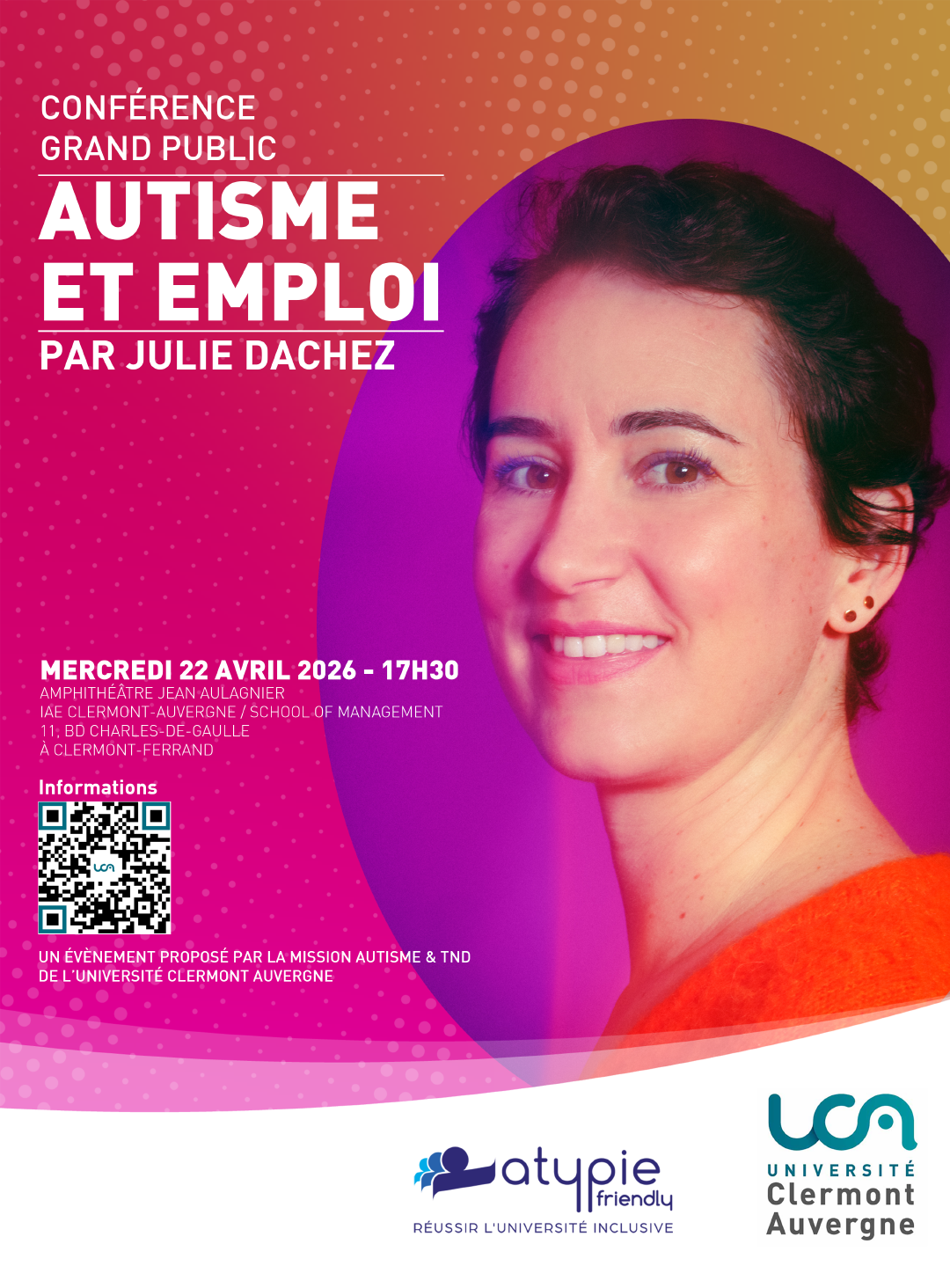 La conférence "autisme et emploi" vise à remettre en question la vision médicale et déficitaire de l’autisme. Les personnes autistes sont simplement différentes, et ont des forces à valoriser ! Julie vous amènera à comprendre comment les comportements atypiques sont au mieux marginalisés au pire psychiatrisés, alors qu'ils devraient être célébrés. La question de l’emploi sera ensuite abordée de fa?on concrète, en décrivant le processus de recrutement et les aménagements à mettre en place pour accueillir un collaborateur autiste.